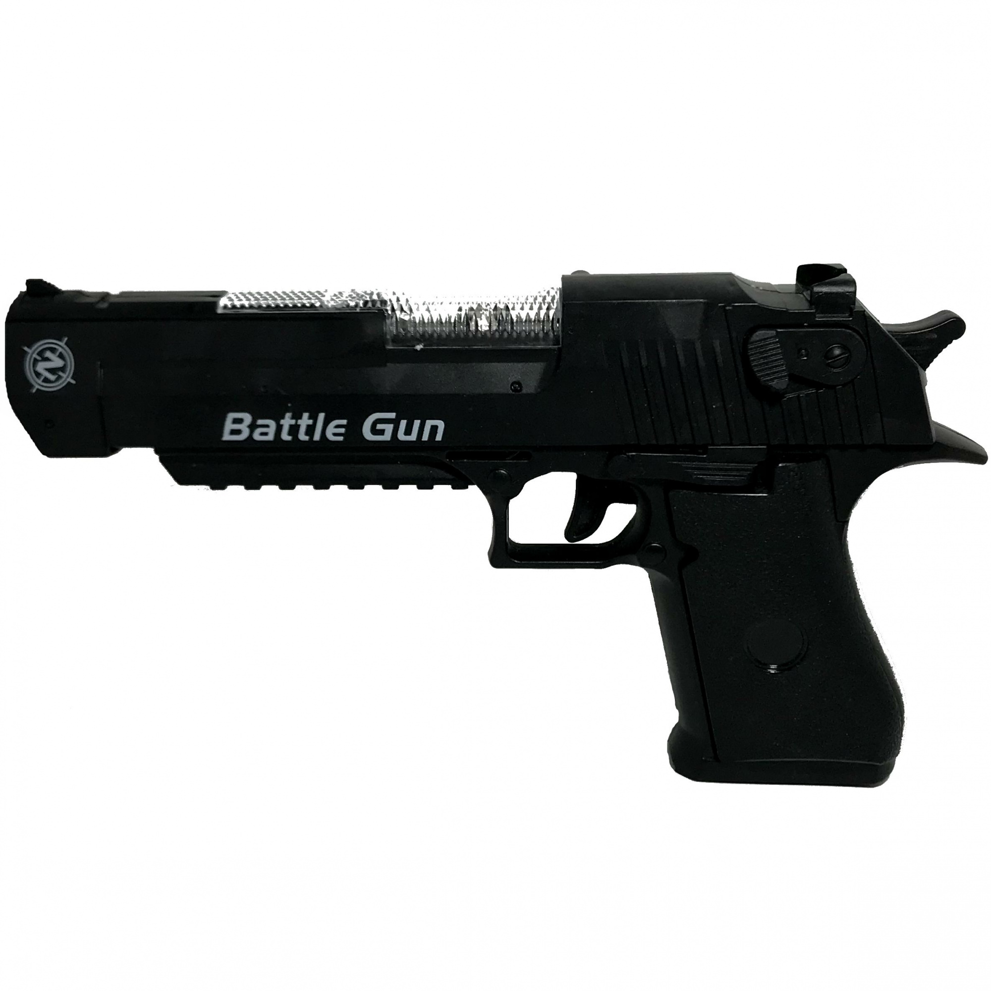 Игрушечный пистолет Desert Eagle с двигающимся затвором, светом и звуком, работающий на батарейках. Пистолет имеет длину от дула до бойка - 22 см, (от обоймы до затвора) - 13,4 см. Затвор пистолета подсвечивается диодным огнем посередине.