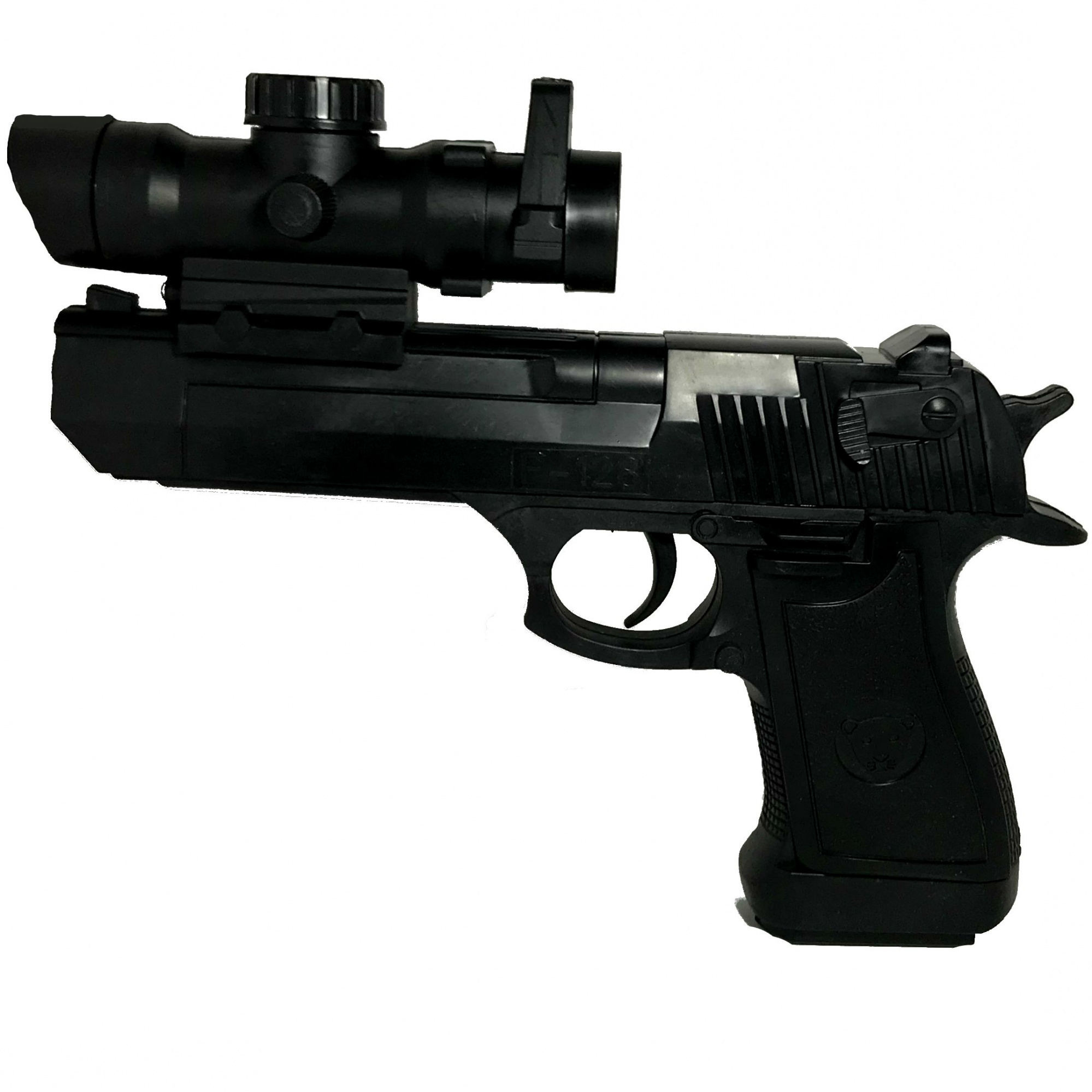 Игрушечный пневматический пистолет Desert Eagle с лазерным прицелом и фонариком имеет длину от дула до бойка - 21,3 см, (от обоймы до затвора) - 13,7 см. У пистолета обойма с пружиной. Курок плоский (под палец), не режет. Спуск легкий. Пистолет хорошо лежит в руке ребенка от 7-ми лет. Затвор пистолета взводится с усилием, но достаточно надежно. У пистолета имеется светодиодный фонарик и лазерный прицел. Обойма пистолета легко вставляется и вынимается. Пистолет стреляет 6 мм шариками. Пистолет имеет хорошую точность. Выстрел ослабленный - травмобезопасный.