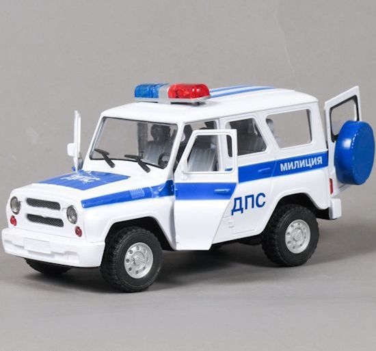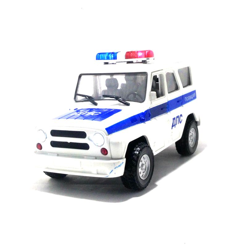Игрушечный полицейский УАЗ HUNTER сделан из пластмассы. Игрушечный полицейский УАЗ HUNTER динамо механизм. Длинна машинки - 18 см, Высота - 11 см, Ширина - 8,2 см. У машинки открываются передние двери и задняя крышка багажника. При открытии передних дверей загораются фары и звучит сигнализация. В багажник можно посадить фигурку заключенного.