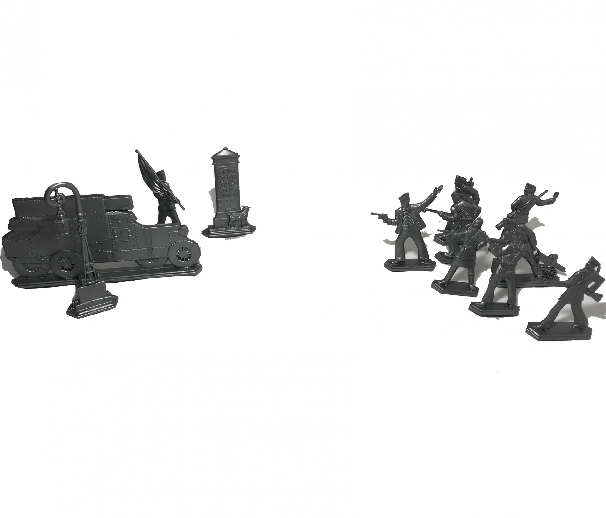 Солдатики матросы - это набор из 9-ти фигурок, броневика и 2-х сюжетных предметов. Материал - качественный пластик. Высота фигурок (стоя) - 5,5 см. Набор посвящен революционным событиям 1917 года. В наборе: командир с маузером, женщина-комиссар с наганом, матрос с пулеметом, матрос со знаменем, матрос стреляющий из винтовки, 2 матроса бегущие в штыковую атаку, матрос, кидающий гранату, матрос идущий в строю. Для визуализации событий Петрограда той эпохи стилизованный фонарный столб и круговой столб объявлений, а так же бронеавтомобиль. С помощью набора Ваш ребенок сможет создать различные сюжеты про "штурм зимнего" и другие эпизоды революционных событий и гражданской войны. Например, по мотивам известных и любимых советских фильмов про революцию и моряков: "Мятежный Орионъ", " Ленин в 18 году", "Человек с ружьем", "Мичман Панин", "Р.В.С.", "Выборгская сторона", "Щорс", "Кто заплатит за удачу", "И был вечер, и было утро", "Мы из Кронштадта", "Эскадра уходит на запад", "Чапаев", "Капитан Старой черепахи". Так же рекомендуем фильмы "Моонзунд" и "Варяг".