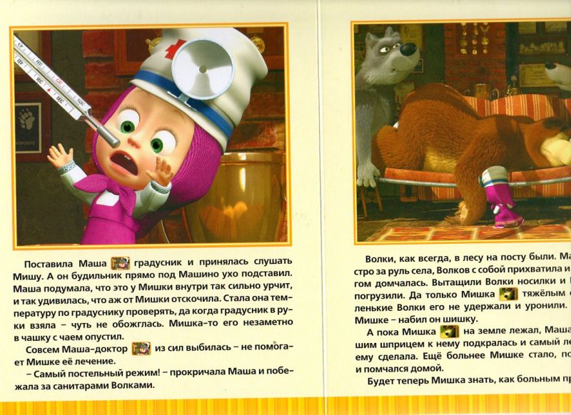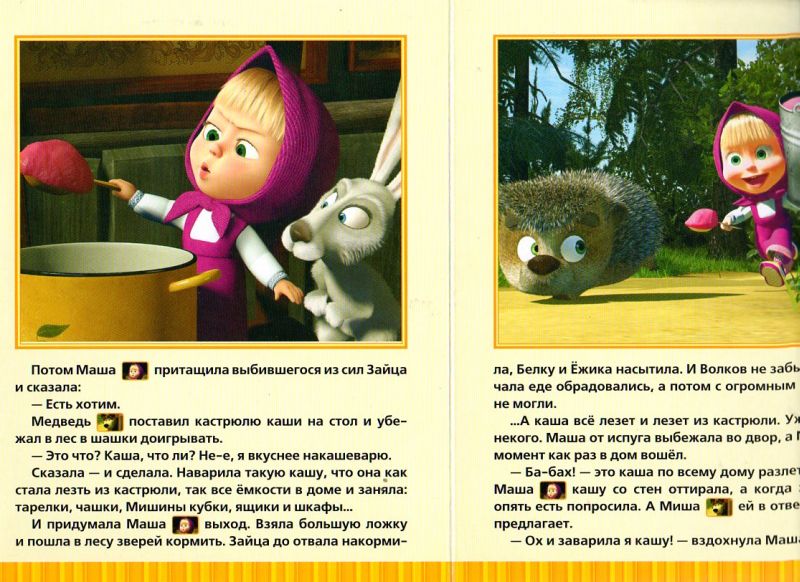 Говорящие книги Маша и медведь - это не просто ярко иллюстрированные, но и озвученные издания. Чтение рассказов можно сопровождать звуковыми вставками, нажимая на боковой панели ту картинку, которая указана в тексте. Размер книжки 22,5х22 см, размер текстовой страницы 17х22 см. В книге 12 страниц с 3-мя рассказами про Машу и медведя и иллюстрациями.