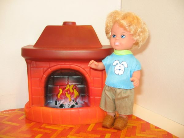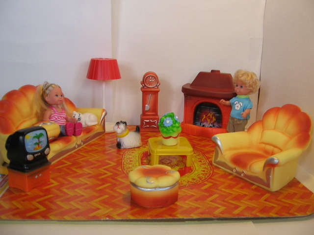 Интерьер для кукольного домика состоит из большого мягкого дивана, одного резинового мягкого кресла, одного резинового мягкого пуфика, пластикового стола и пластикового торшера, напольных часов, камина, телевизора на тумбочке, горшочка с цветами, кошки и собаки. Вся мебель располагается на плотной картонной подложке, имитирующей пол дома. Так же в набор входят 2 миниатюрные куклы. Данный набор мебели подходит для оборудования "домика для куклы".