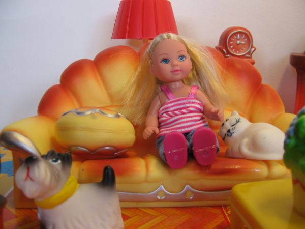 Вся мебель располагается на плотной картонной подложке, имитирующей пол дома. Так же в набор входят 2 миниатюрные куклы. В приведенном на фото примере в комплекте куклы Evi и Timmi от Simba Toys (Germany). Одежда и вид кукол могут изменятся в зависимости от выпускаемых производителем вариантов.