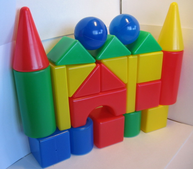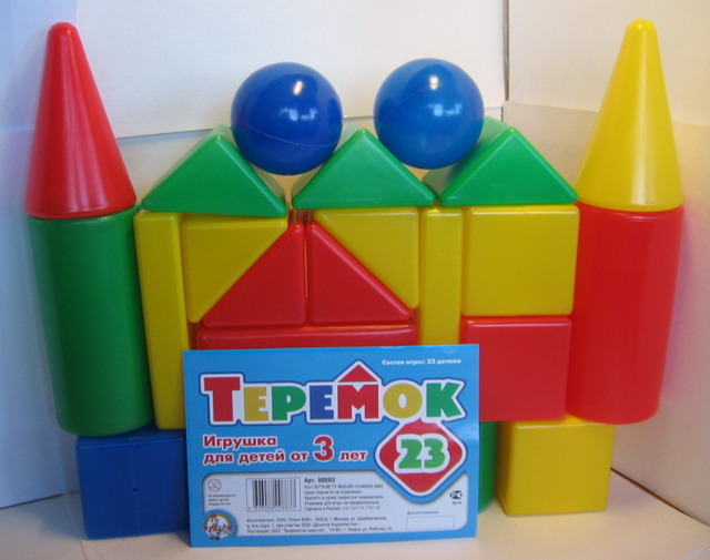Набор строительных элементов "Теремок-23" из пластмассы для детского творчества. Игрушка изготовлена из материалов, применяемых для производства пластмассы для пищевых продуктов, и пищевых красителей. Экологически безопасна. Производитель: ООО "Пласт-БЭК" (Московская обл., Щелковский р-н, пос. Свердловский, ул. Центральная, 1).