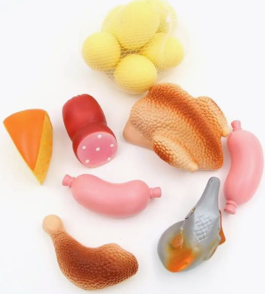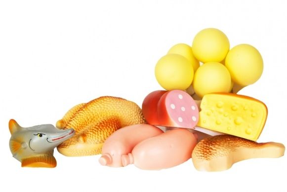 Набор игрушечных продуктов называется "Вкусные продукты" и состоит из 5-ти элементов: куриная ножка (10 см), сарделька (10 см), сыр (7 см), хлеб - батон белого (10 см) и шоколадное мороженое (9,5 см). Изготовлен из мягкой резины (ПВХ), приятной на ощупь (что особенно важно для малышей) на российском заводе (ЗАО ПФК "Игрушки г.Воронеж) ,что гарантирует качество и токсическую безопасность изделия. Набор подходит для игр в кухню и приготовление пищи. Например, сардельку ребенок может варить в кастрюльке и подавать к обеду на тарелочке. Из куриной ножки можно сварить суп или запечь ее в духовке. Игрушечный кусок сыра можно подавать к чаю на тарелоче. Так же с этим набором можно играть в покупки (в магазин) и даже ребенок сможет сочетать 2 игры: сначала поход за продуктами и их покупка, потом приготовление из них обеда. Подходит комплект и для купания ребенка - так как это резиновые игрушки.