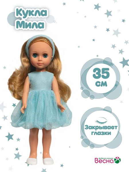 Кукла Мила модница в красивом платье с воздушной юбкой с подъюбником. На ногах пластмассовые туфли. Волосы качественные (нейлон) густые, длинные, которые интересно расчесывать. Они надежно закреплены (прошивные, а не наклеенные). Кукла изготовлена на известном российском предприятии "Весна" и поэтому экологически и токсически безопасна. Ручки и голова сделаны из винила, туловище и ноги — из пластмассы. Очень удачный наряд позволяет легко одевать и раздевать куклу (застежка на липучке на спине), что не раздражает ребенка и повышает интерес к кукле. Игрушка предназначена детям от 2-3-х лет. Кукла Мила - это простая кукла без лишних затей. Её достоинство - долговечность в процессе детских игр. Рекомендуем её для детских дошкольных учреждений.