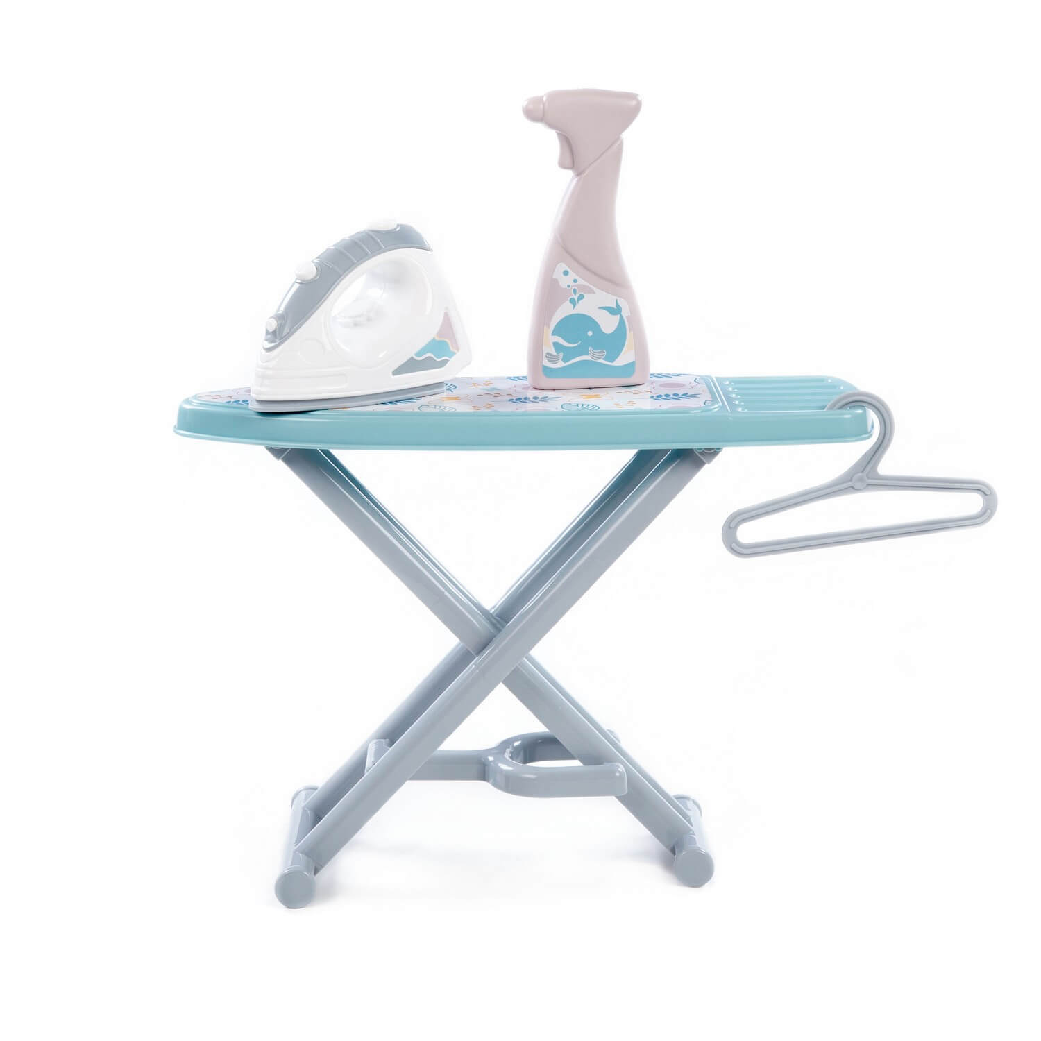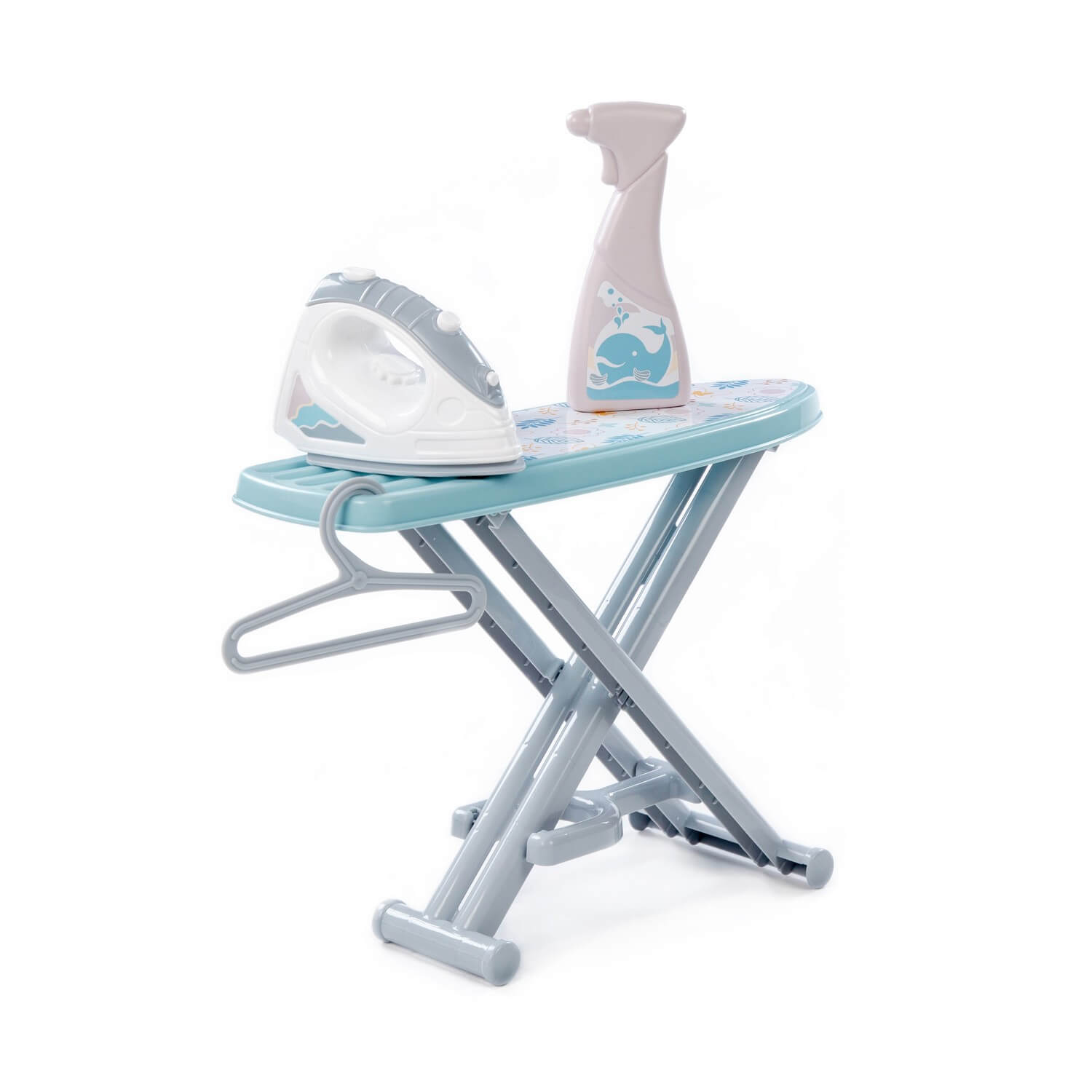 Набор игровой «Утюжок № 3 с гладильной доской, пульверизатором и вешалкой» предназначен для сюжетно-ролевых игр дома, в игровых комнатах или детских садах. Доска легко складывается и не занимает много места. Элементы набора имеют удобную для детской руки форму. Набор выполнен в серо-голубом цвете и продаётся в красочной коробке.